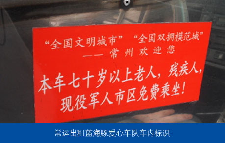 常運(yùn)出租駕駛員盛凱(常州市十佳文明出租車駕駛員)發(fā)起“三免車輛”( 即:現(xiàn)役軍人、70歲以上老人、殘疾人市區(qū)免費(fèi)乘坐),得到了多位駕駛員的響應(yīng),公司現(xiàn)已成立常運(yùn)出租藍(lán)海豚愛(ài)心車隊(duì),為特殊群體出行提供免費(fèi)乘車服務(wù)。